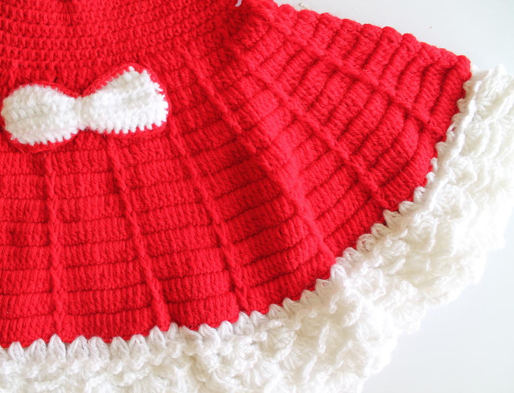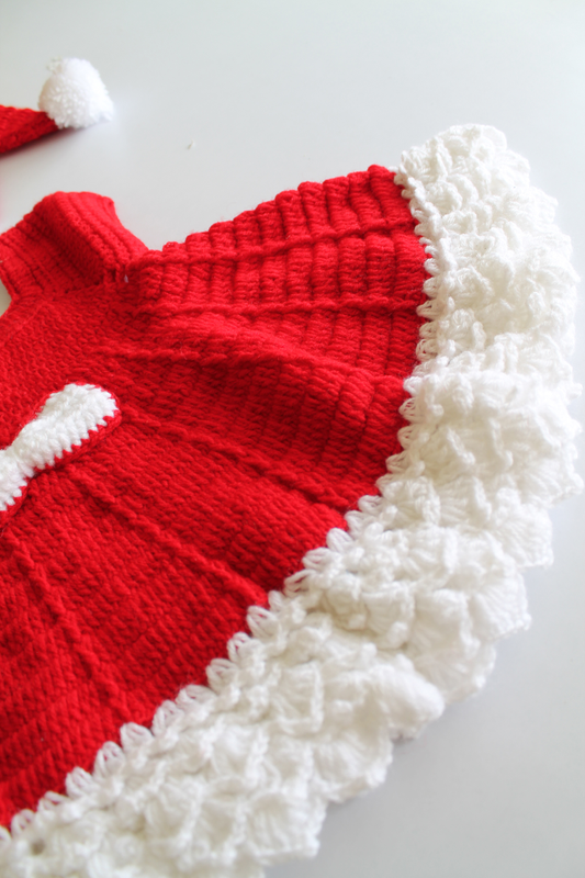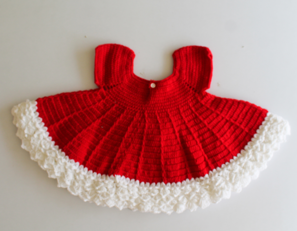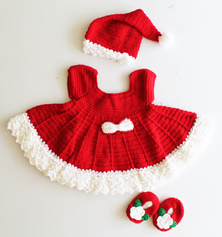 Woonie Crochet Flared Frock with Matching Cap and Booties- Red
